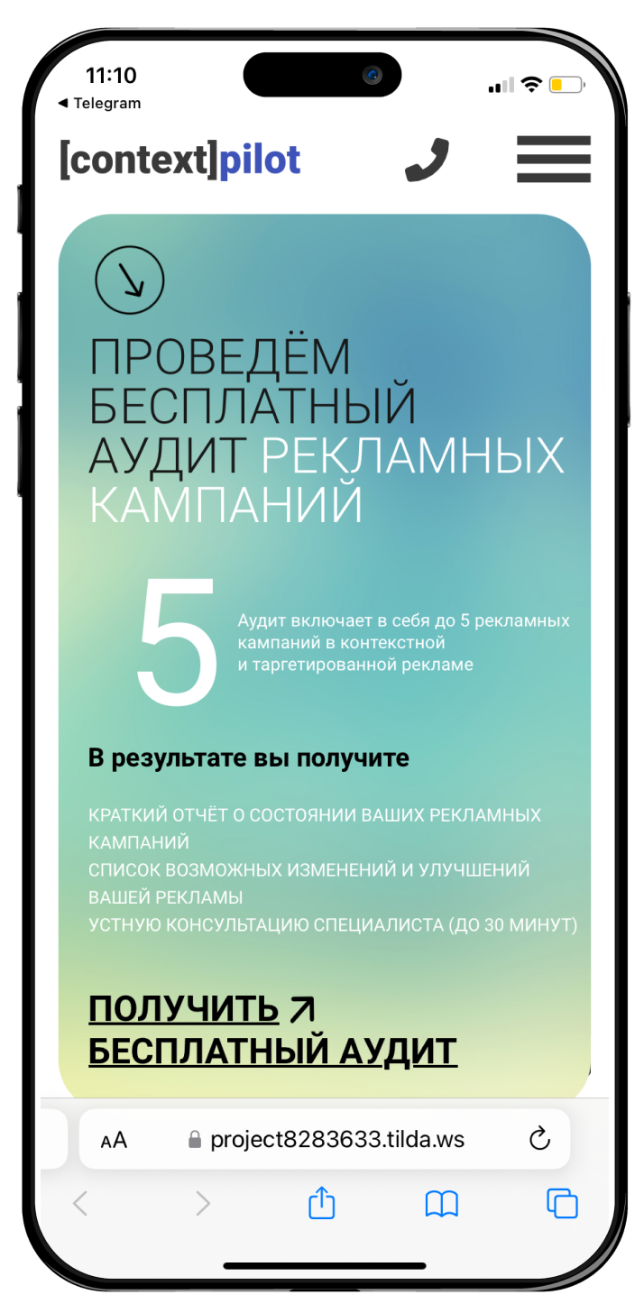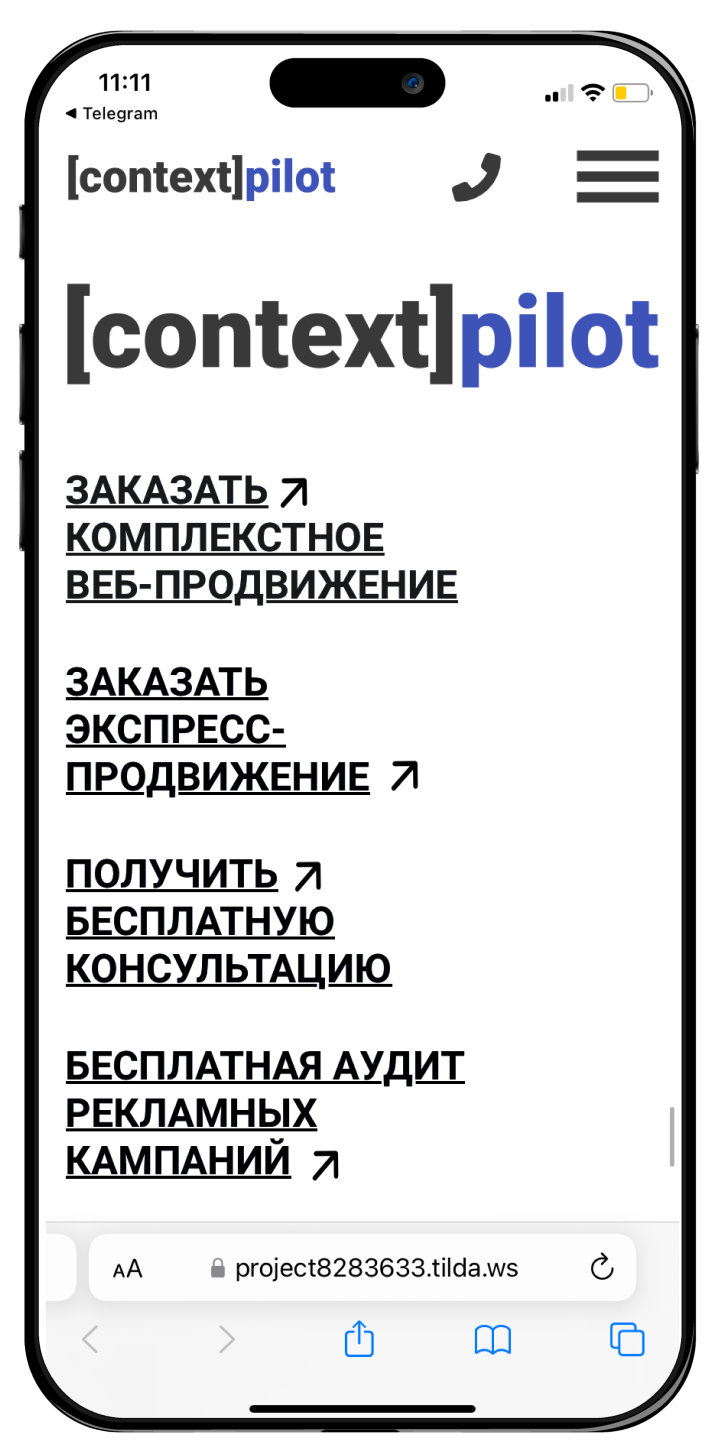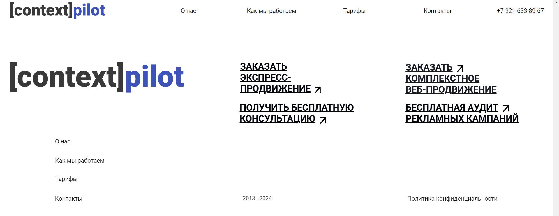 Кнопки ведущие на блоки о предоставляемых услугах: бесплатном аудите, бесплатной консультации, а также услуге по экспресс продвижению и комплексном веб продвижении были выведены на первую страницу, для того, чтобы сократить пусть пользователя до целевого действия